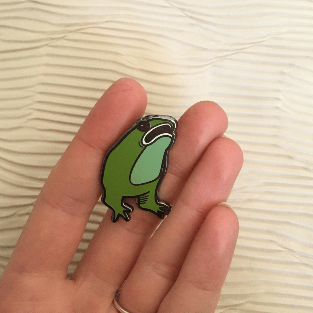 A hard enamel pin designed by me featuring an armless little frog hopping around! Image is adapted from a detail of the triptych "The Garden of Earthly Delights" by medieval painter Hieronymus Bosch. The pin is approximately 3.8 centimetres (1.5 inches) tall. It includes a black nickel finish and two black rubber clutches to hold it secure on any bag, garment, or other pin-able surface.
