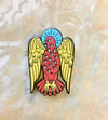 A hard enamel pin designed by RBrittonArt featuring a majestic red eagle covered in watchful eyes! Image is adapted from an illustration in a medieval manuscript. The pin is approximately 4.5 centimetres (1.75 inches) tall. It includes a black nickel finish and two black rubber clutches to hold it secure on any bag, garment, or other pin-able surface.